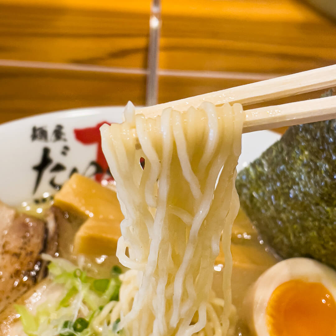 背脂のコクに煮干し、アサリを使ったさっぱりした味のスープに、手揉みした平打の中太ちぢれ麺を合わせた「だいくう中華そば」