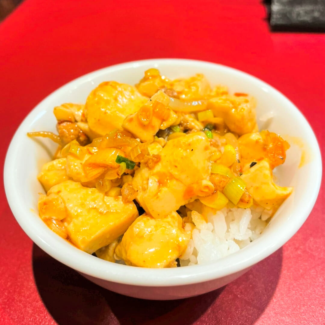 麺を食べ終わると残った麻婆豆腐をセットで付いてくる「小ライス」にON❗️ミニ麻婆丼の完成です✨