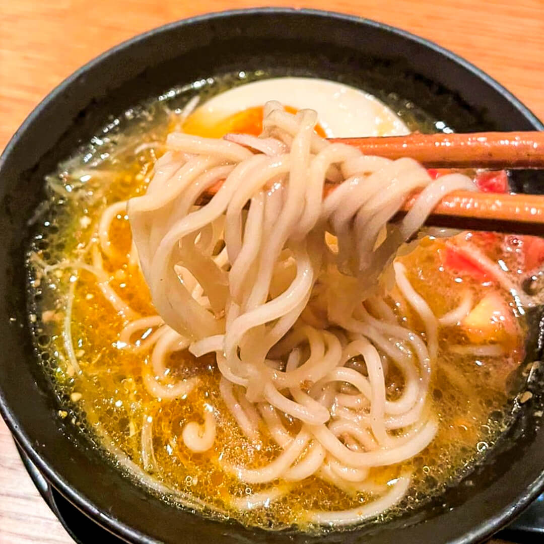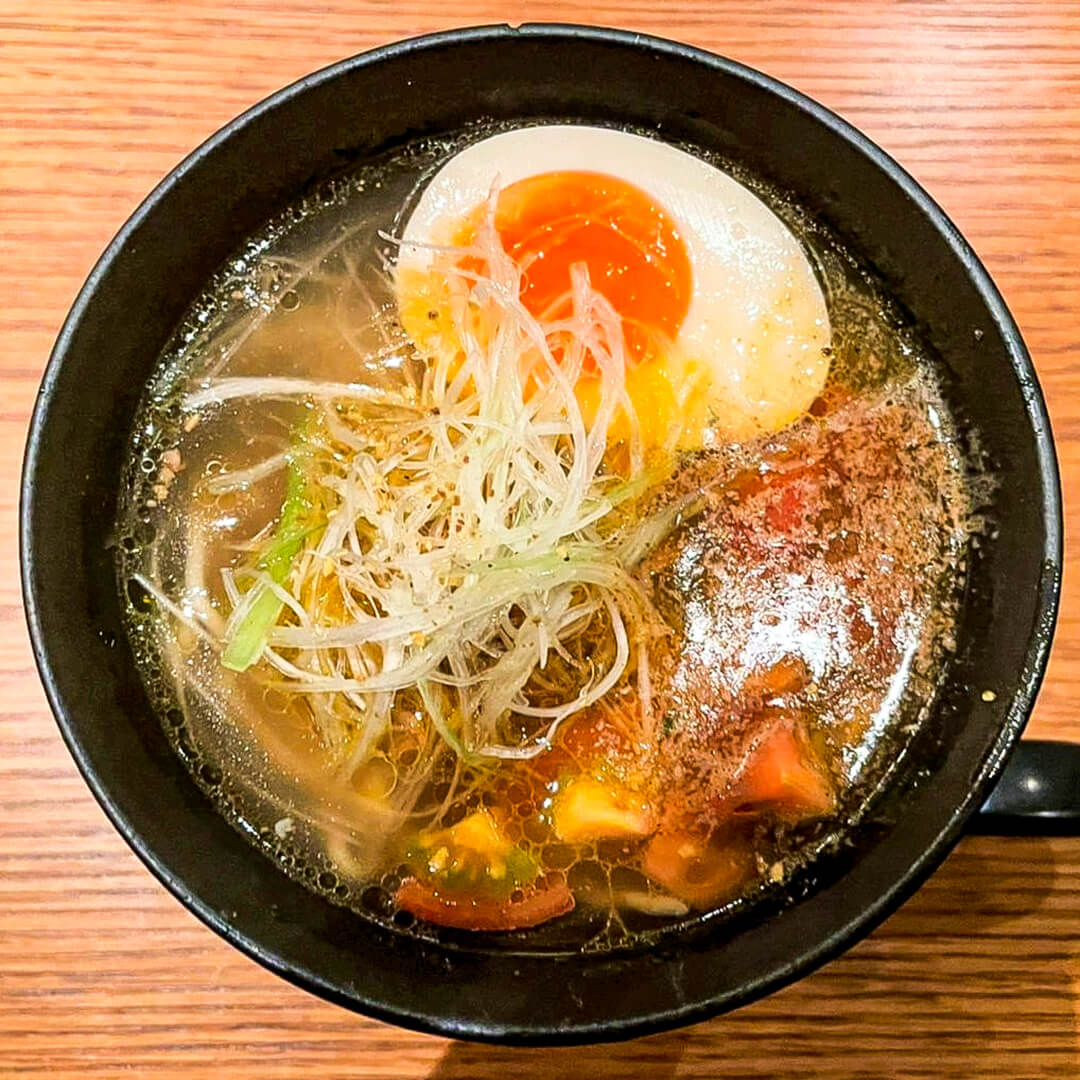 ベースはあさっさりとしていて刻んだトマトがアクセントになりさっぱりとしているので、〆のラーメンとしてぴったりです🍜
