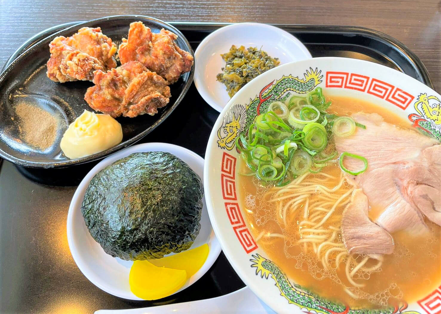内容は、豚骨ラーメン+鶏の唐揚げ(3個)+中ご飯+高菜炒めが全部いただけます🥰