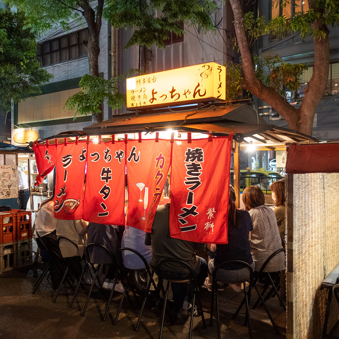 中洲川端駅から徒歩5分、清流公園内に18:00より店を構える「博多屋台 よっちゃん」さん