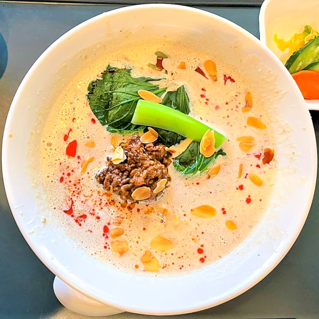 アーモンド担々麺、クリーミーなスープにラー油が味を引き締め、後ひく旨さの担々麺です😋