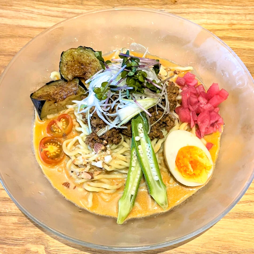 オクラ、茄子、トマトなどの夏野菜がたっぷりと乗ったカレーの香りと、担々麵のピリッとしたまろやかなソースは食欲をかきたてられます🎵