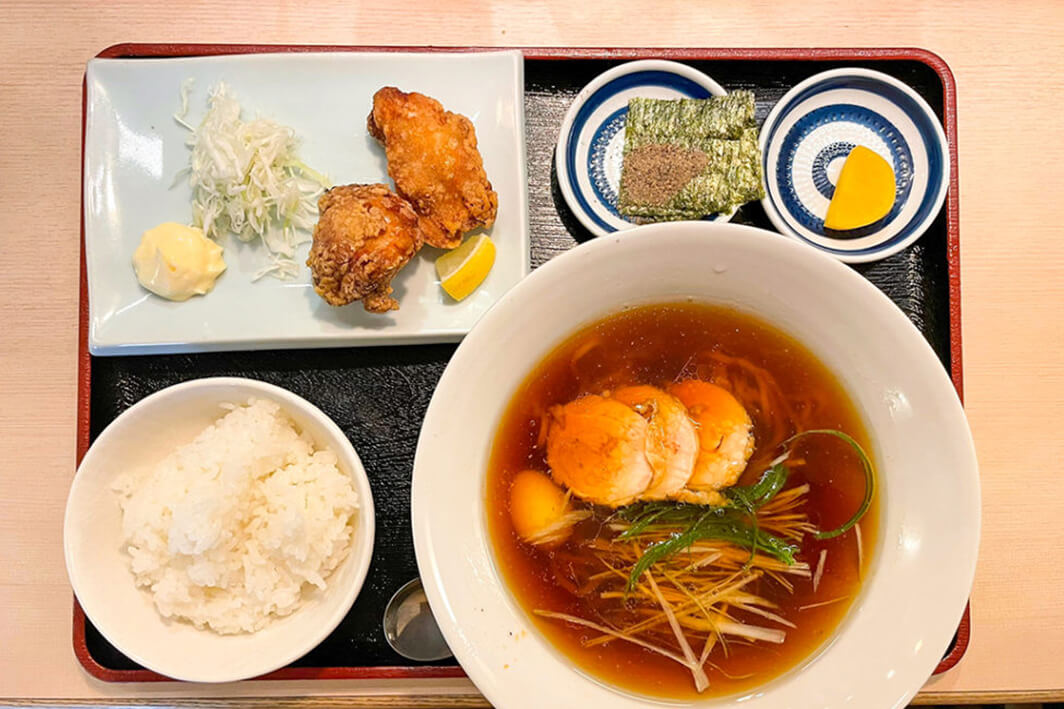 ラーメンは醤油、塩ベースどちらかから選べ、+100円でご飯と唐揚げ、漬物がついてきます❗️