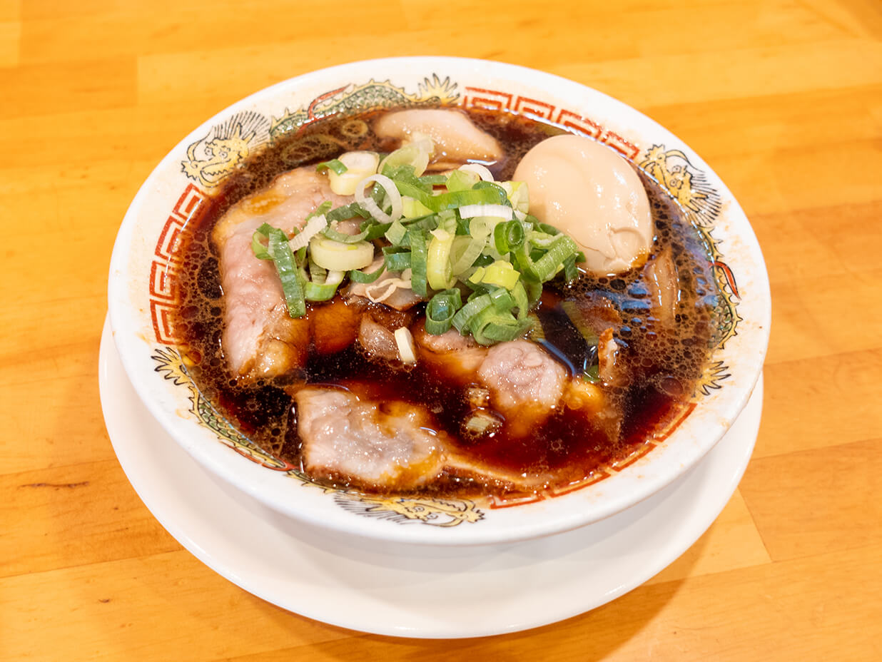 「熟成醗酵醤油」を使用した真っ黒なスープは、福岡では珍しい味わい。