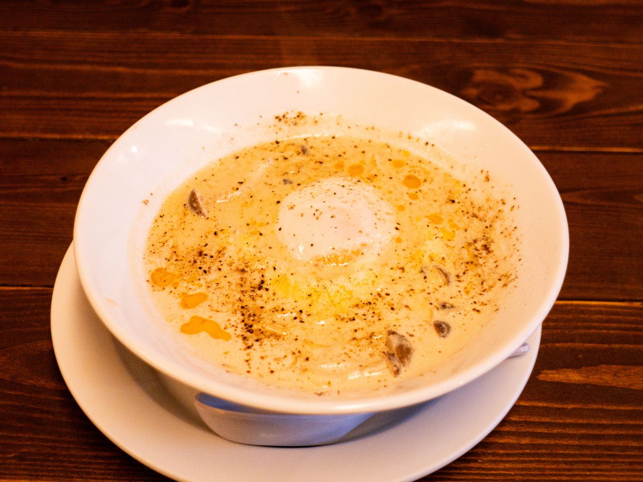 カルボナーラ坦々麺は、たっぷりのチーズと温玉、オリーブラー油、きのこが入った坦々麺となっており、濃厚なチーズの風味とラー油の効いたピリ辛なスープの組み合わせがたまらない一杯です。