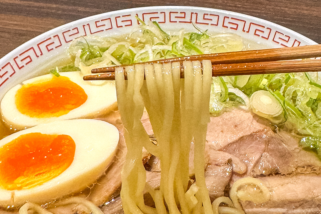 合わせる麺は中太平打ち麺。あっさりとしたスープにまろやかな麺がよく絡んで、食べやすさを増してくれています。
