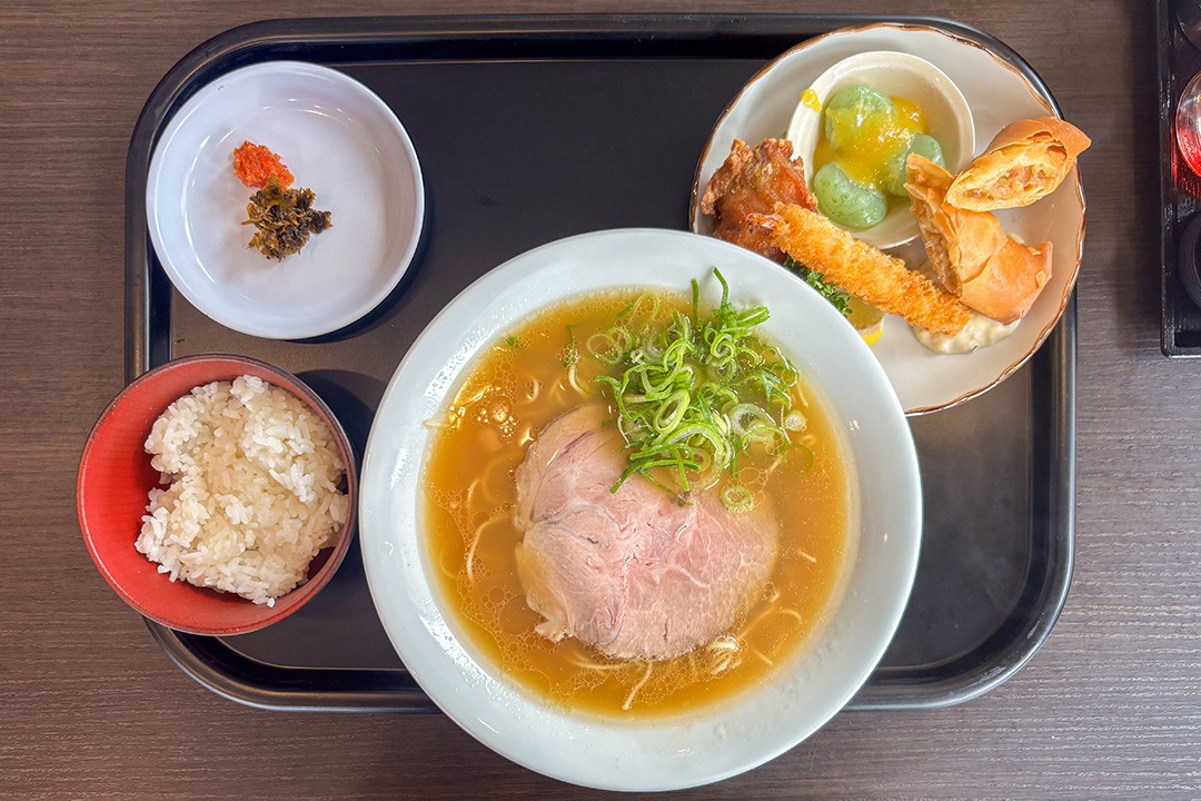 今回注文した「ラーメン定食」は、ラーメン・ご飯に加え、唐揚げや海老フライなどの揚げ物が添えられており満足感のある一品となっています。
