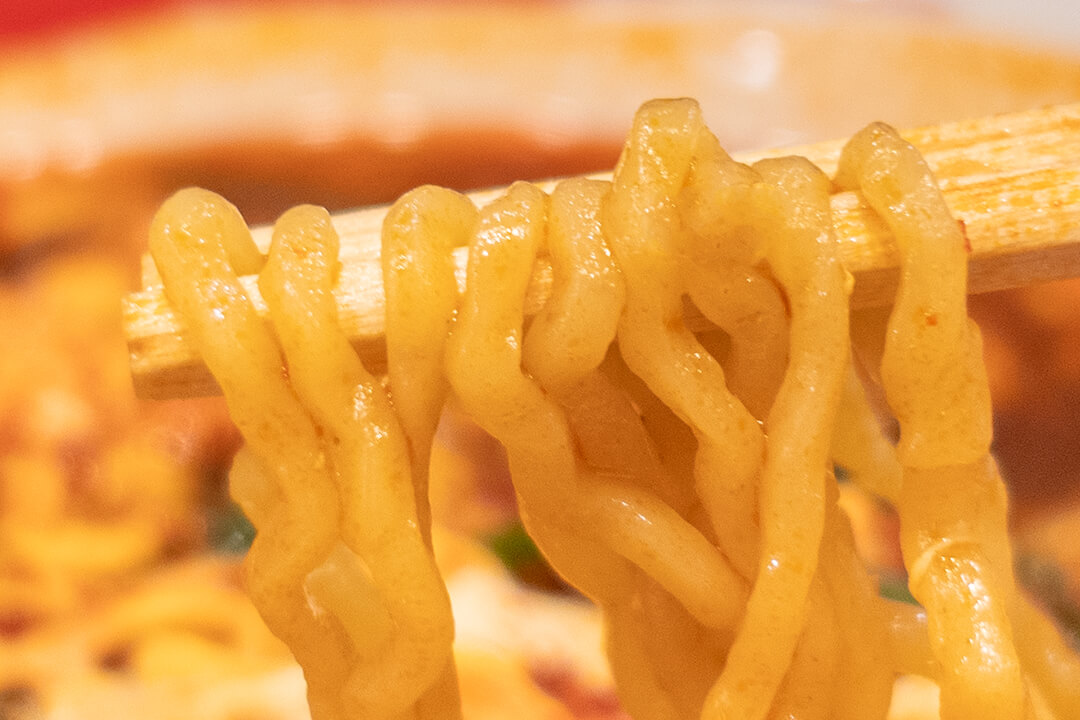 合わせる麺は、中太ちぢれ麺。麺にスープがガッツリ絡んでくれるので、辛味がより引き立ちます。