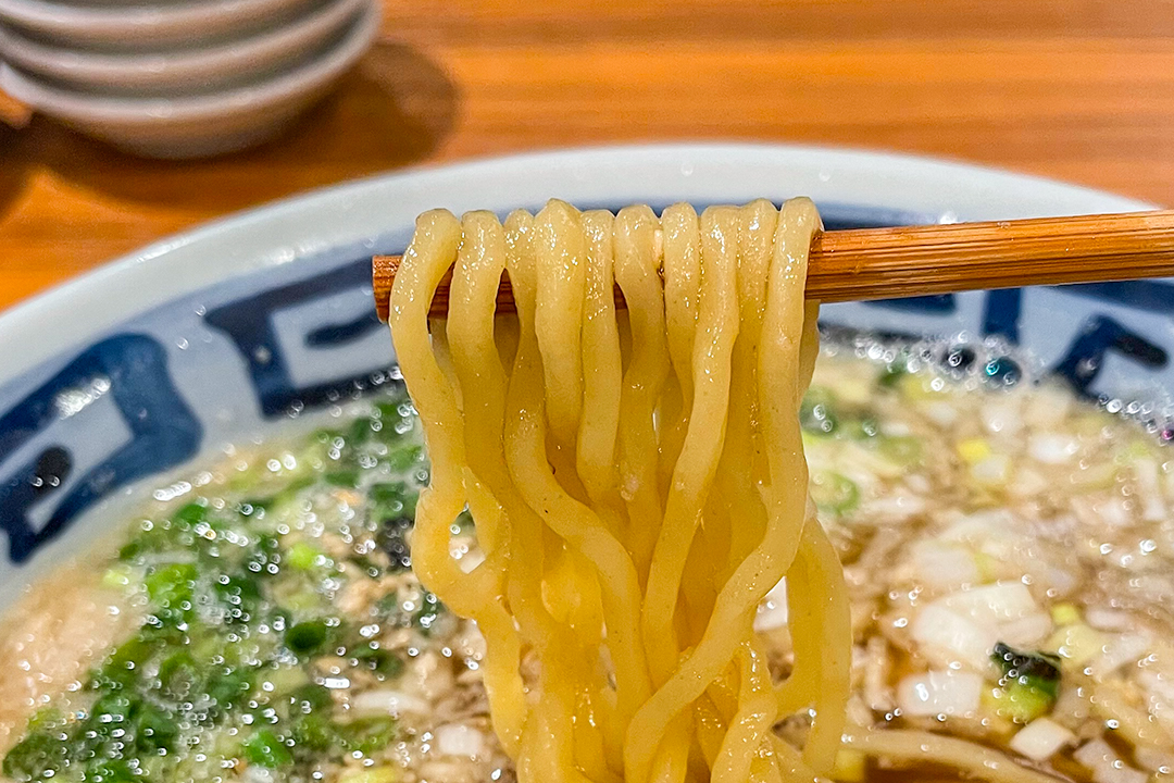 合わせる麺は、中太ちぢれ麺で優しいスープをしっかりと包み込んでくれます。