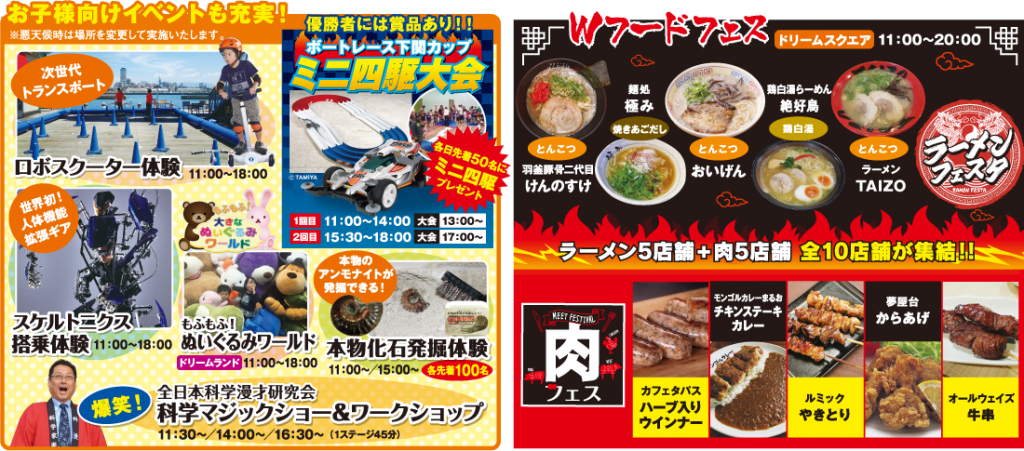 お子様向けのイベントも充実しており「ロボスケーター」「ミニ四駆大会」「化石発掘体験」「ぬいぐるみワールド」などなど、各日先着50名にミニ四駆のプレゼントもありますので、一日中楽しめますよ~(´✪ω✪`)♡