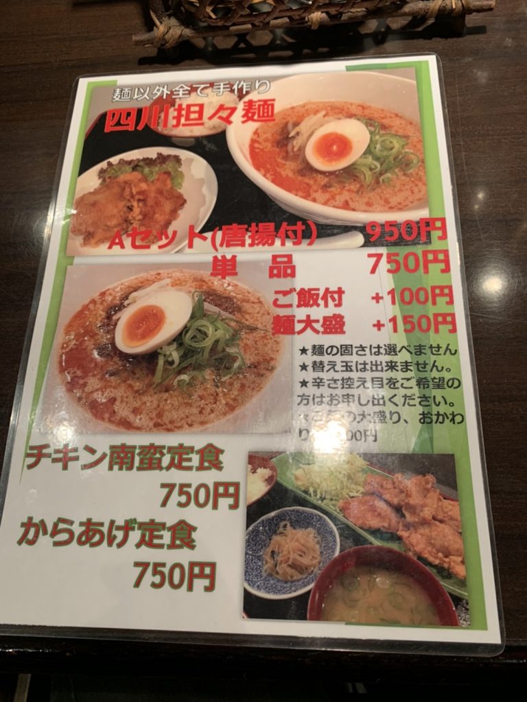 【四川坦々麺】は「単品」「ごはん付+100円」「めん大盛り+150円」などから選べる店主おススメメニュー✧*。(ˊᗜˋ*)✧*。♪