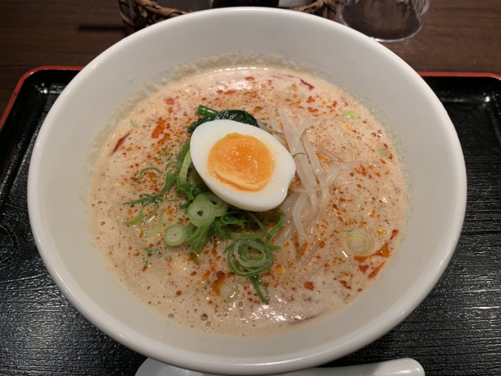 【四川坦々麺】のスープは鶏ガラをベースに「辛味」と「胡麻」をプラス、トッピングのたっぷり入った「肉味噌」を溶かすと「コク」と「旨味」が感じられ濃厚、辛さもマイルドに、麺はストレートの卵麺で「肉味噌」や「胡麻」の具材が、たっぷり絡みますよ~(๑´ڡ`๑)