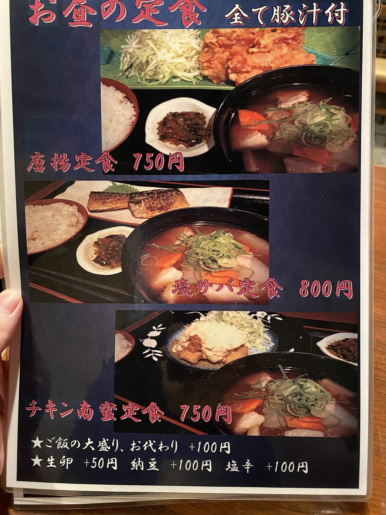 ランチメニューは他に「日替わり定食 700円」「唐揚定食 750円」「塩サバ定食 800円」「チキン南蛮定食 750円」「カツカレーうどん 800円」があります