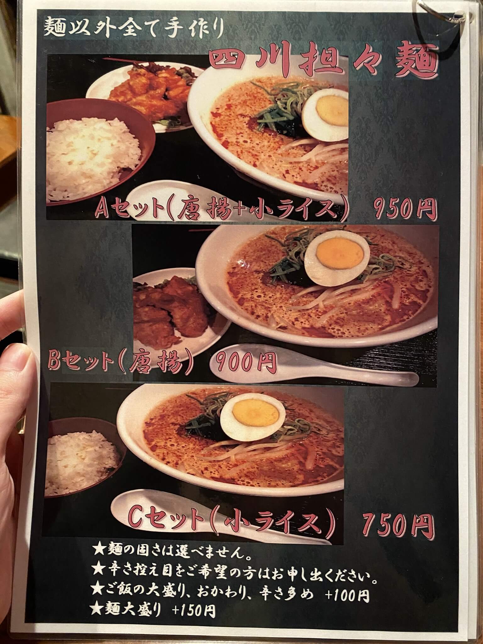 「四川坦々麺」はご飯のついたCセット 750円、唐揚げのついたBセット 900円、唐揚げ+ご飯のAセット 950円の3種類から選べます。