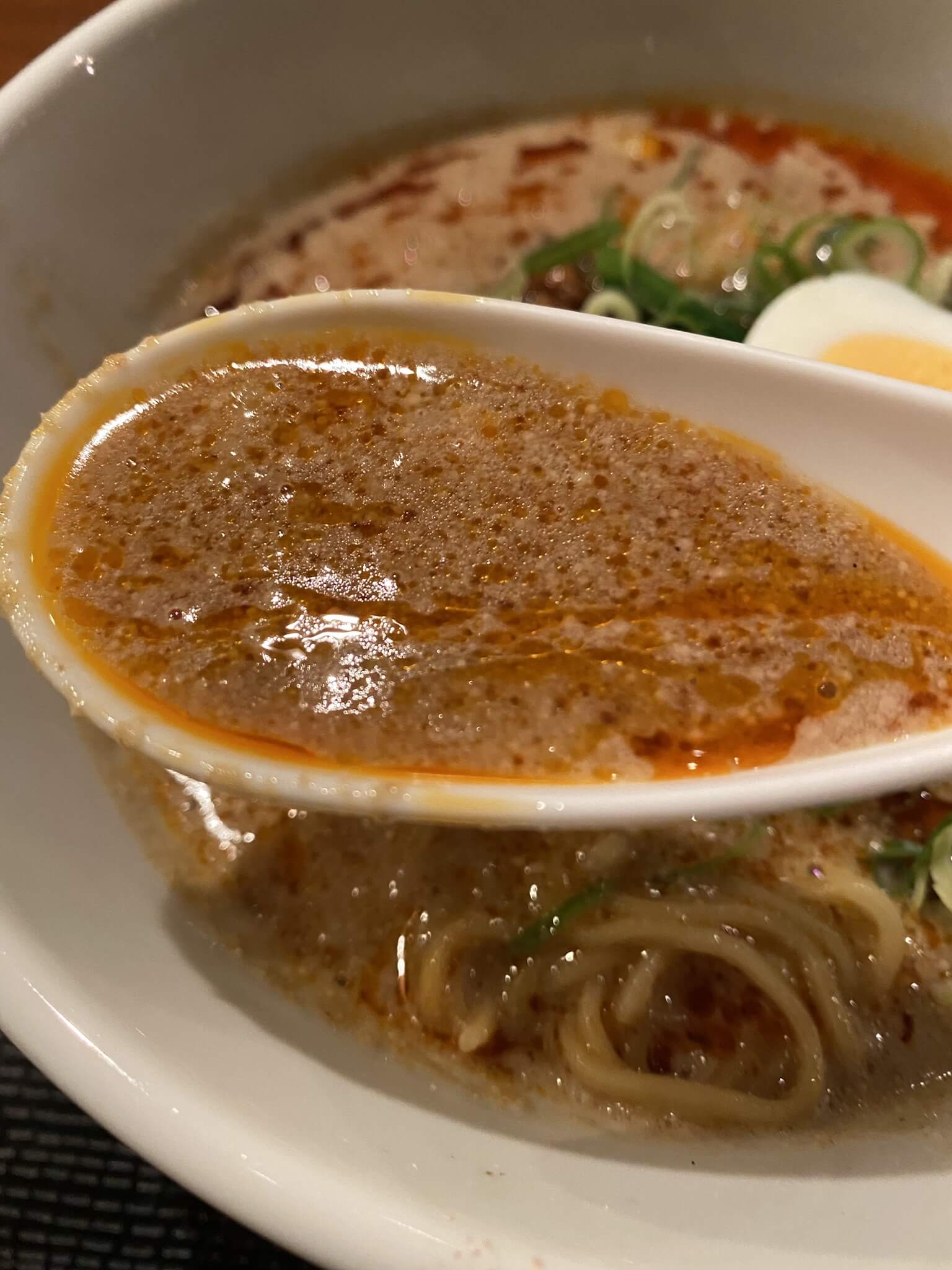 スープは鶏ガラをベースに「辛味」と「胡麻」をプラス、トッピングの「肉味噌」を溶かすとコクと旨味が感じられ、辛さもマイルドに