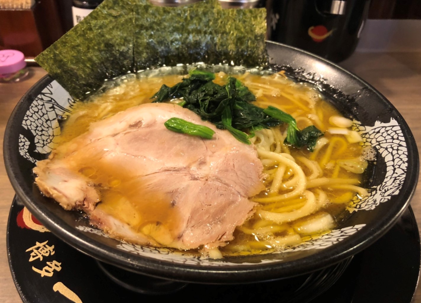 トッピングには「海苔・ホウレン草・チャーシュー」と家系お決まりの具材に、麺は慶史製の「逆切り中細麺」を使用☝