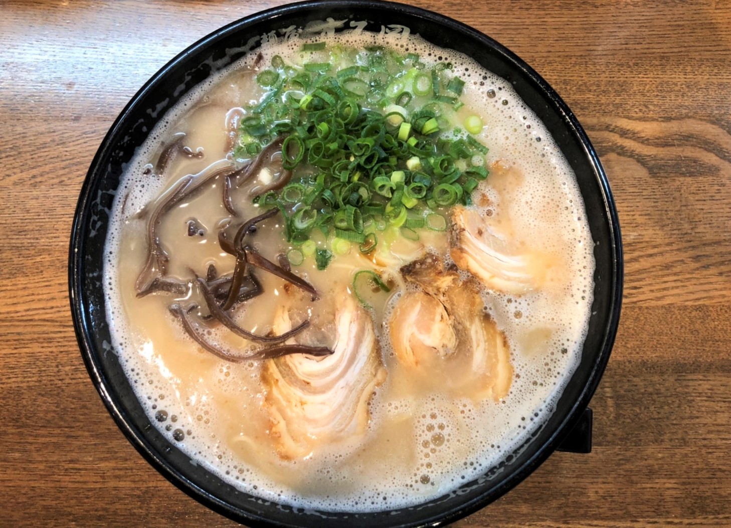 濃度のある豚骨スープに醤油タレで味もしっかりとしており、コシの強い少加水麺との相性は抜群です?