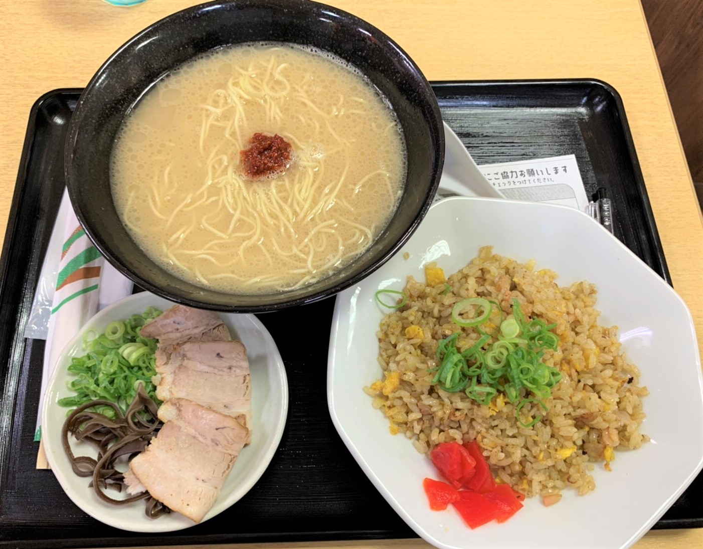 セットメニューにある「半炒飯」は、しっかりと炒めたご飯にふんわり卵、トッピングに青ネギと福神漬けが嬉しいです(^^♪ ラーメンがどちらかと言うとあっさり目ですので、炒飯の味はしっかり目で、一緒に食べていてとても美味しいですのでお勧めのセットです?