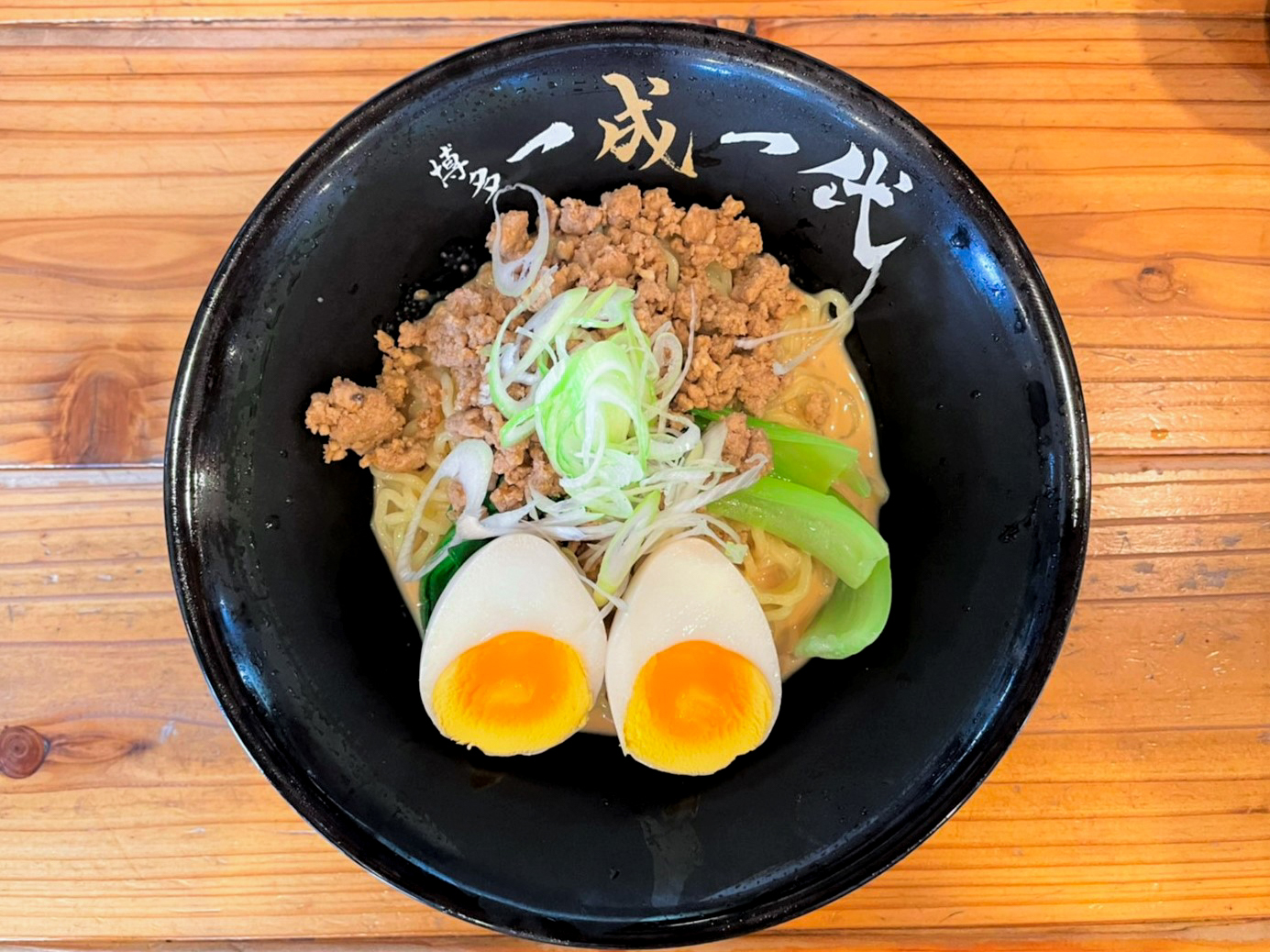 濃い目の担々スープにミンチ、青梗菜、玉子、白髪ネギが乗っておりボリューム満点!