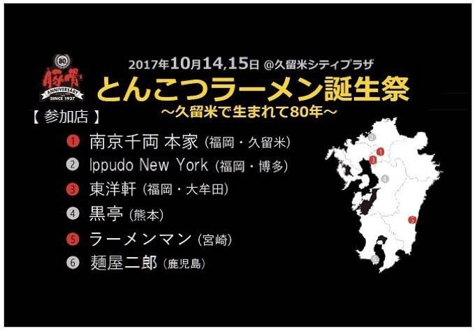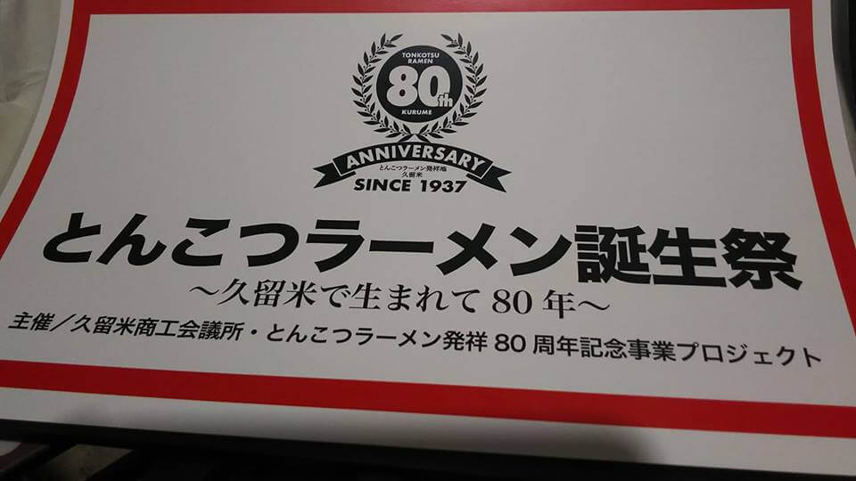 昭和12年に、久留米市の明治通りに産声をあげた「とんこつラーメン」は、今年で80歳、まさに傘寿を迎えました。これを記念し、「とんこつラーメン」の発祥とされる屋台「南京千両」の80年の誕生祭にふさわしい「オリジナルラーメン」を、また九州一円の「とんこつラーメン」の名店が、自慢のラーメンを提供するイベントとして「とんこつラーメン誕生祭~久留米で生まれて80年~」を開催されています(≧∇≦)?