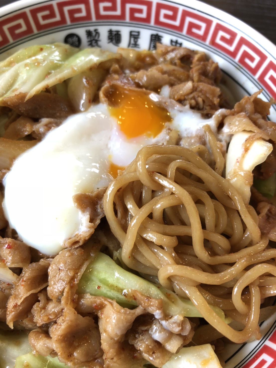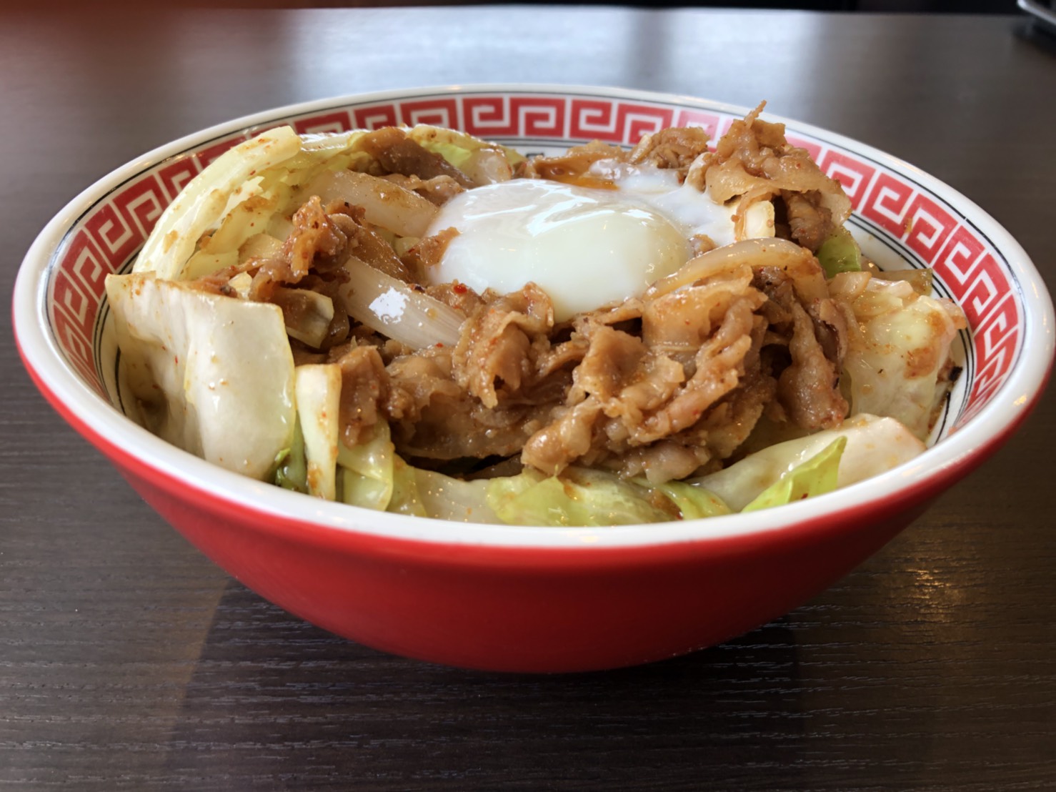 トッピングはキャベツ、玉ねぎ、豚バラ肉をニンニクダレで炒め、さ・ら・に「温玉」も乗せたスタミナ満点のトッピングです